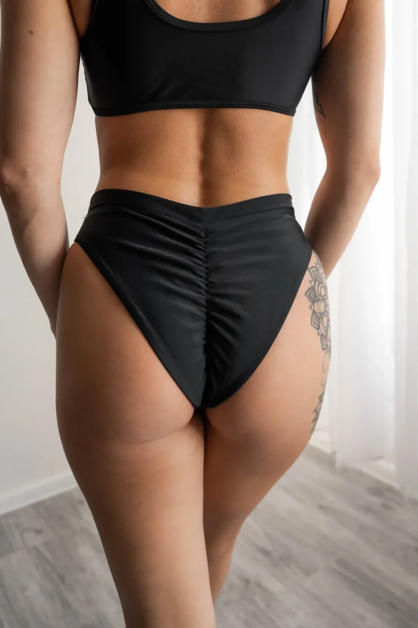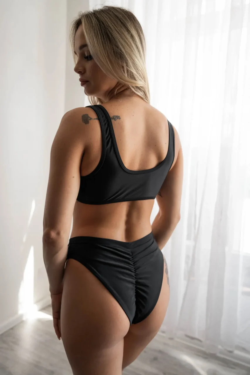 Model ma lekko podwyższony stan, który delikatnie modeluje okolice brzucha i bioder. To praktyczne rozwiązanie, które daje pewność ruchu bez uczucia skrępowania. Dół stroju do pole dance w czerni świetnie trzyma się ciała, nie zsuwa się ani nie roluje – możesz tańczyć bez konieczności poprawiania stroju.