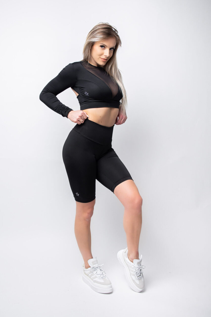 Kolejna odsłona kultowych legginsów sygnowanych marką Gym Star. Tym razem w modnej wersji biker, w stylu popularnych w latach 90’ kolarek o długości przed kolano. W wersji Gym Star bikery mają modelujący talię szeroki pas, który znakomicie wydłuża sylwetkę i eksponuje kobiece kształty. Spodenki Black Ruff zaprojektowane zostały dla aktywnych kobiet, które doskonale znają siłę swojego seksapilu i uwielbiają podkreślać walory swojego ciała. Wymodelowane ciało podczas intensywnych treningów zasługuje na właściwą oprawę. Pomogą Ci w tym nasze bikery, które staną się nie tylko Twoim ulubionym elementem sportowej garderoby, ale i przełamią Twój codzienny ubiór na lato. Konstrukcja bikerów została tak stworzona, by wyeksponować krągłe pośladki, podnieść je i zawęzić talię. Co więcej, Twoja figura zyska więcej kobiecości. Bikery uwydatnią wygląd Twoich bioder, wydobywając z nich to, co najpiękniejsze. Pożądana sylwetki klepsydry nareszcie jest możliwa, również w przypadku szczupłej sylwetki.
