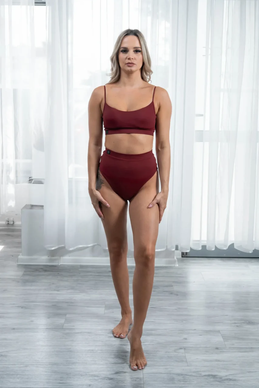 Wykonany z myślą o najwyższej wygodzie i stylu, ten top jest idealny dla pasjonatek pole dance, które szukają ubioru, który poradzi sobie z każdym wyzwaniem i jednocześnie podkreśli ich sylwetkę. Elegancki, Wiśniowy materiał (78% ECONYL, 22% elastan) jest nie tylko trwały, ale też elastyczny, co gwarantuje swobodę ruchów i idealne przyleganie do ciała.